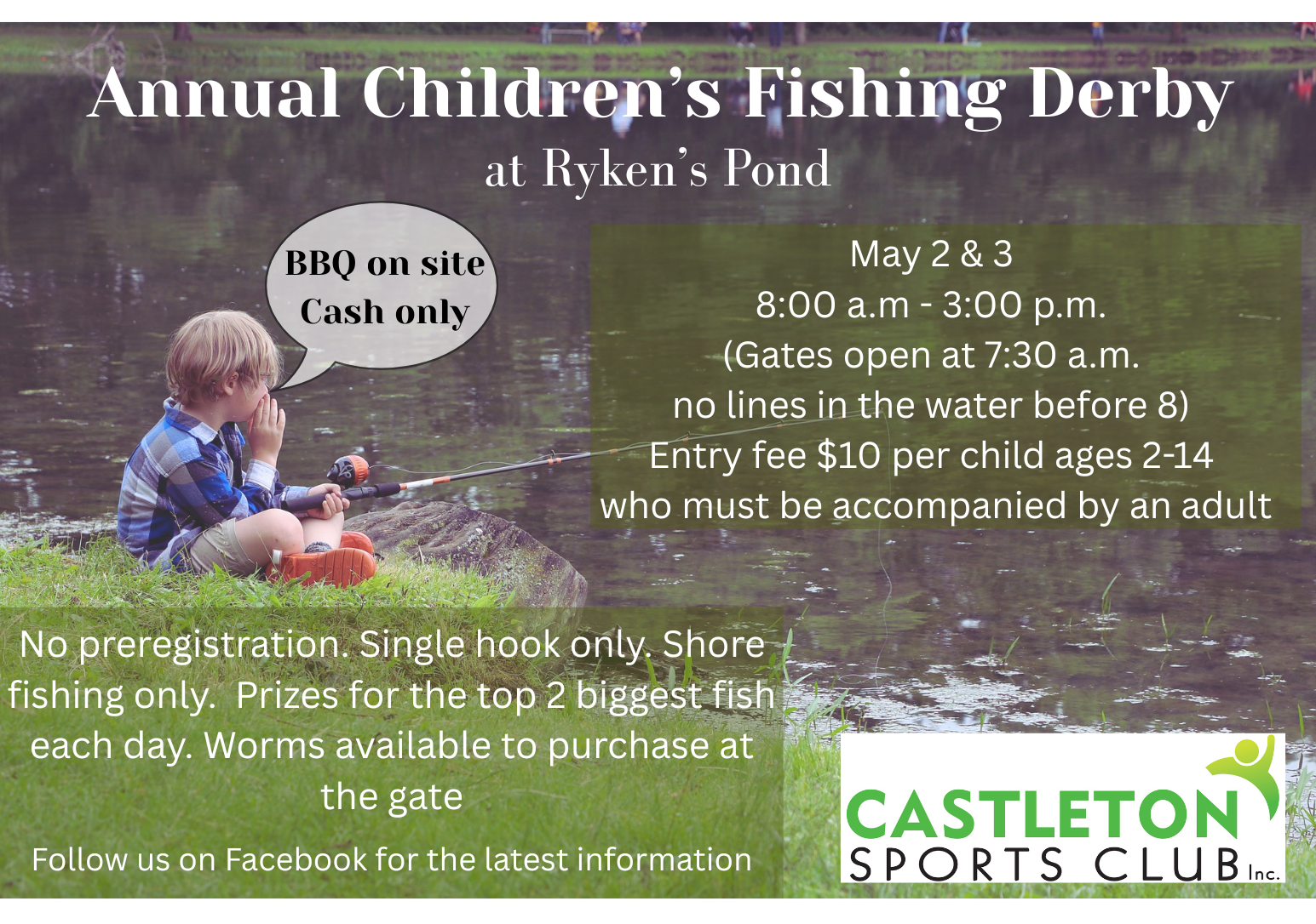 The Annual Children’s Fishing Derby is fast approaching. We need volunteers for Sunday, morning & afternoon shifts available. Contact booking@castletonsportsclub.ca to help. If you’re planning to bring your child, all information can be found HERE. Please note: this is private property, the address of the pond will not be posted. Look for the signs